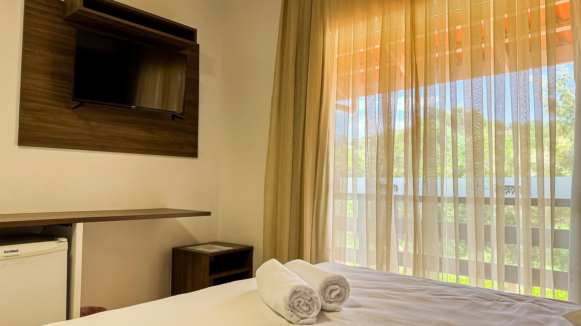 Relaxe em suítes confortáveis com ar-condicionado, TV a cabo e frigobar.