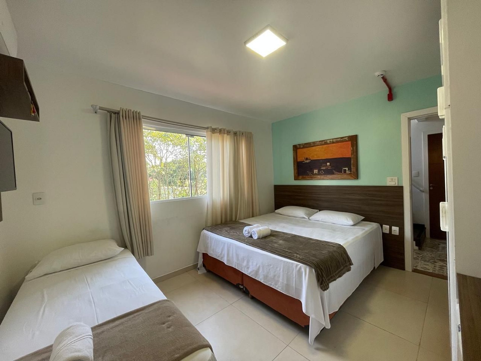 A suíte oferece TV a cabo, frigobar, ar-condicionado e banheiro privativo com chuveiro a gás, garantindo uma estadia agradável e relaxante.