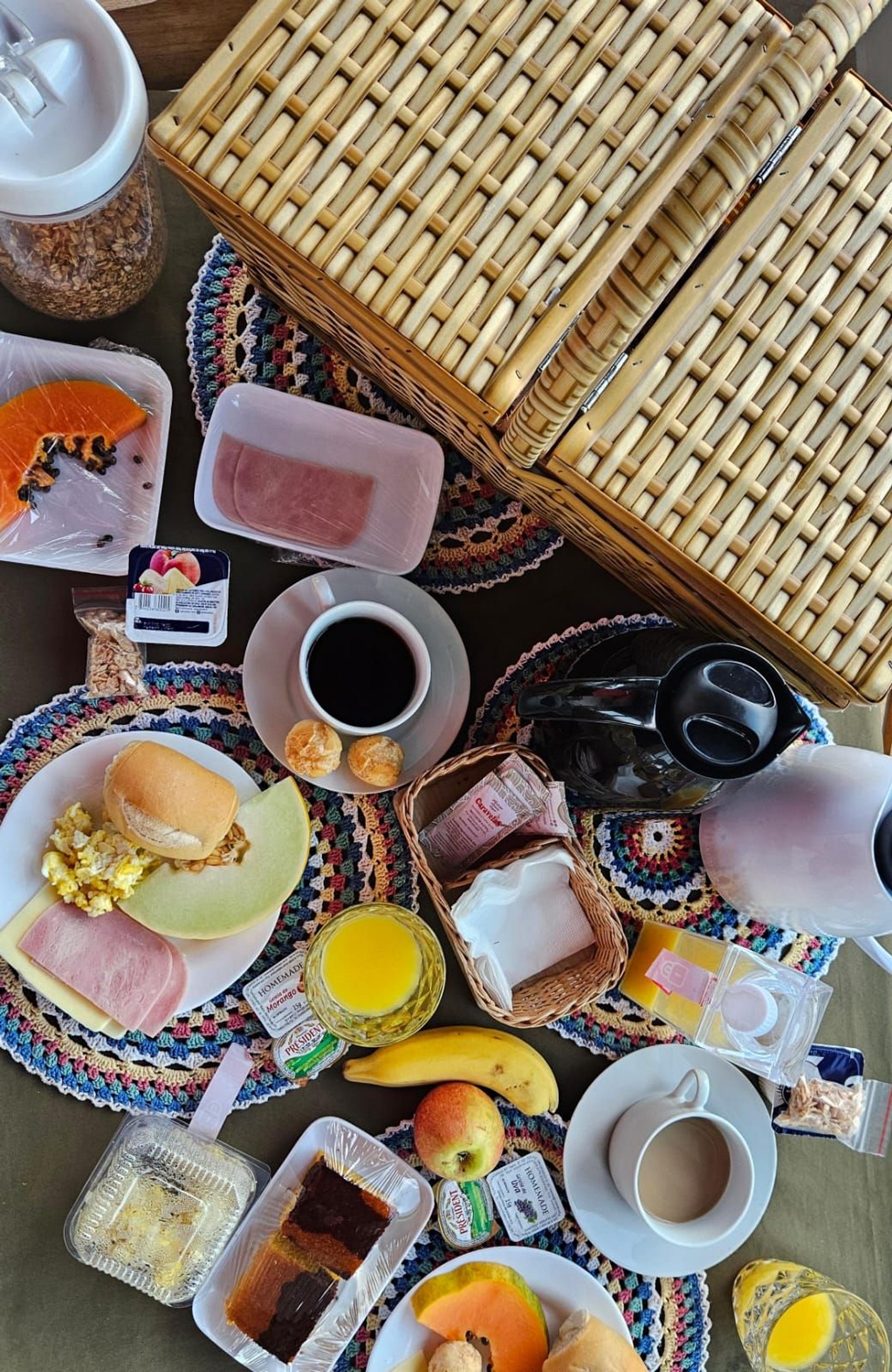O café da manhã, servido no terraço com uma vista deslumbrante, em cestas de pique nique, é um verdadeiro banquete de sabores caseiros e frescos.