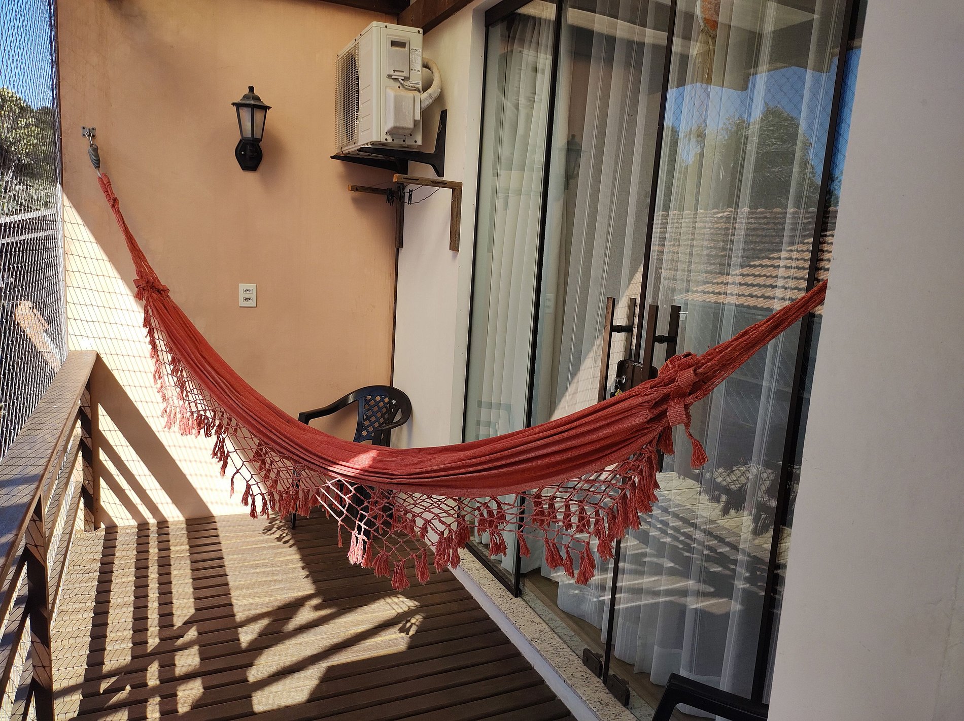 A suíte oferece TV Smart, frigobar, ar-condicionado, secador de cabelo e banheiro privativo, e varanda exclusiva com rede de balanço, garantindo uma estadia agradável e relaxante.