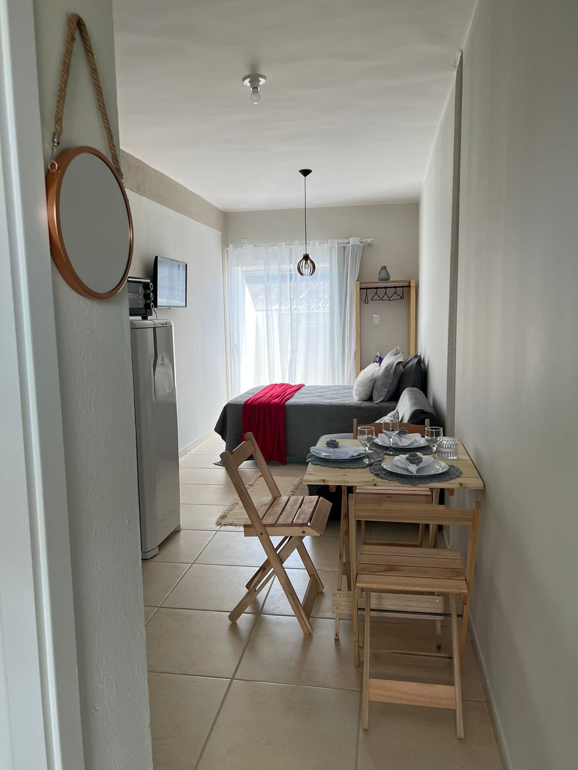 Nosso estúdio acomoda até 3 pessoas (uma cama de casal + um sofá cama), combinando conforto e praticidade em um ambiente aconchegante.