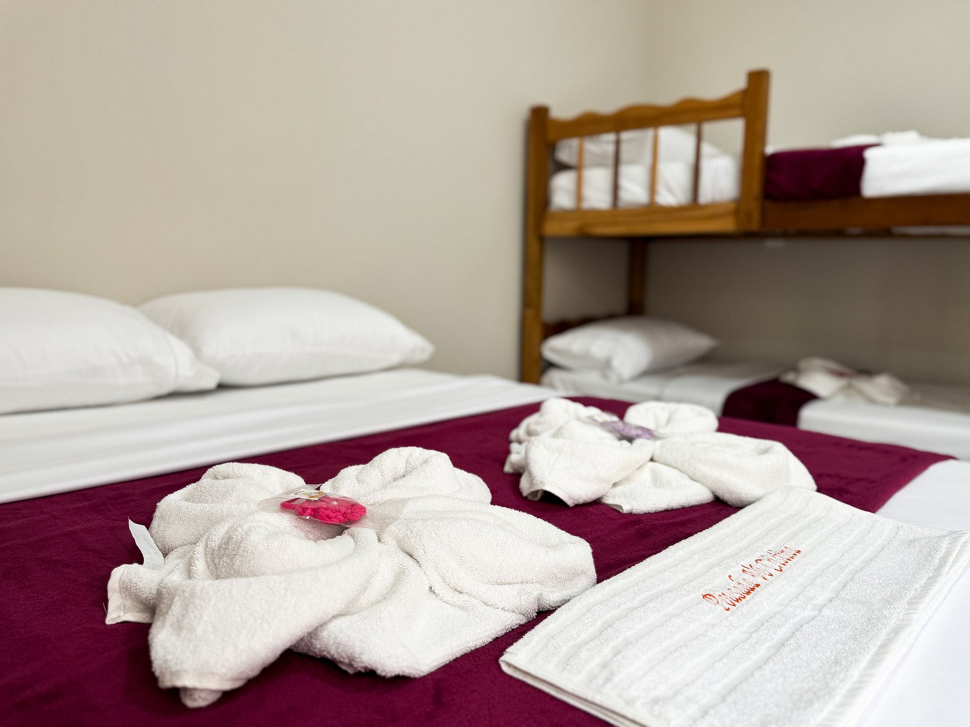 Os apartamentos são totalmente equipados, oferecendo cozinha compacta para maior conveniência e banheiros privativos, além de ar-condicionado, garantindo uma estadia confortável.