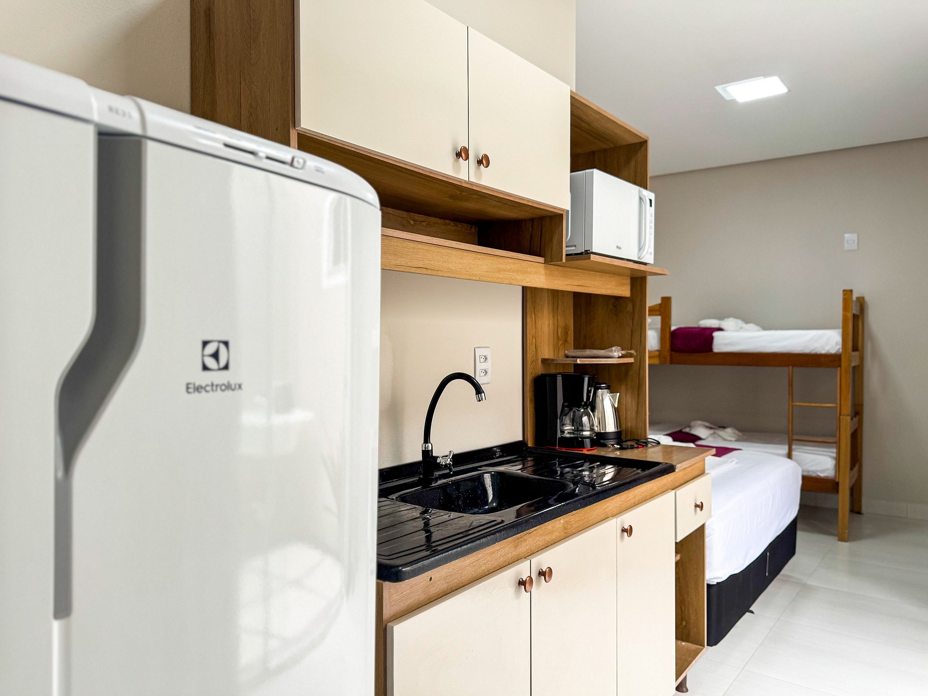 Os apartamentos são equipados com mini cozinha, ideal para preparar suas refeições, além de ar-condicionado, Wi-Fi gratuito e estacionamento privativo para sua comodidade.