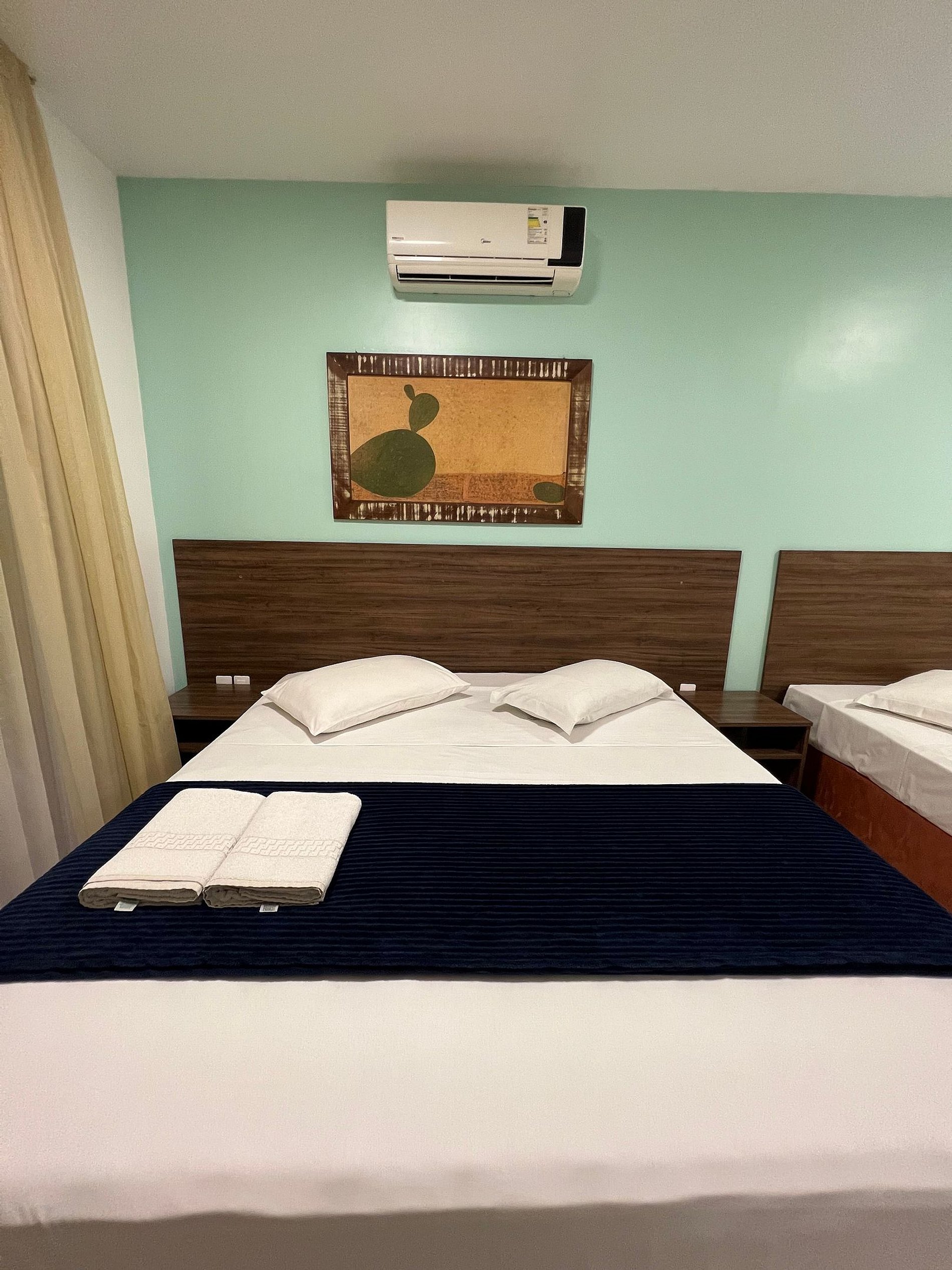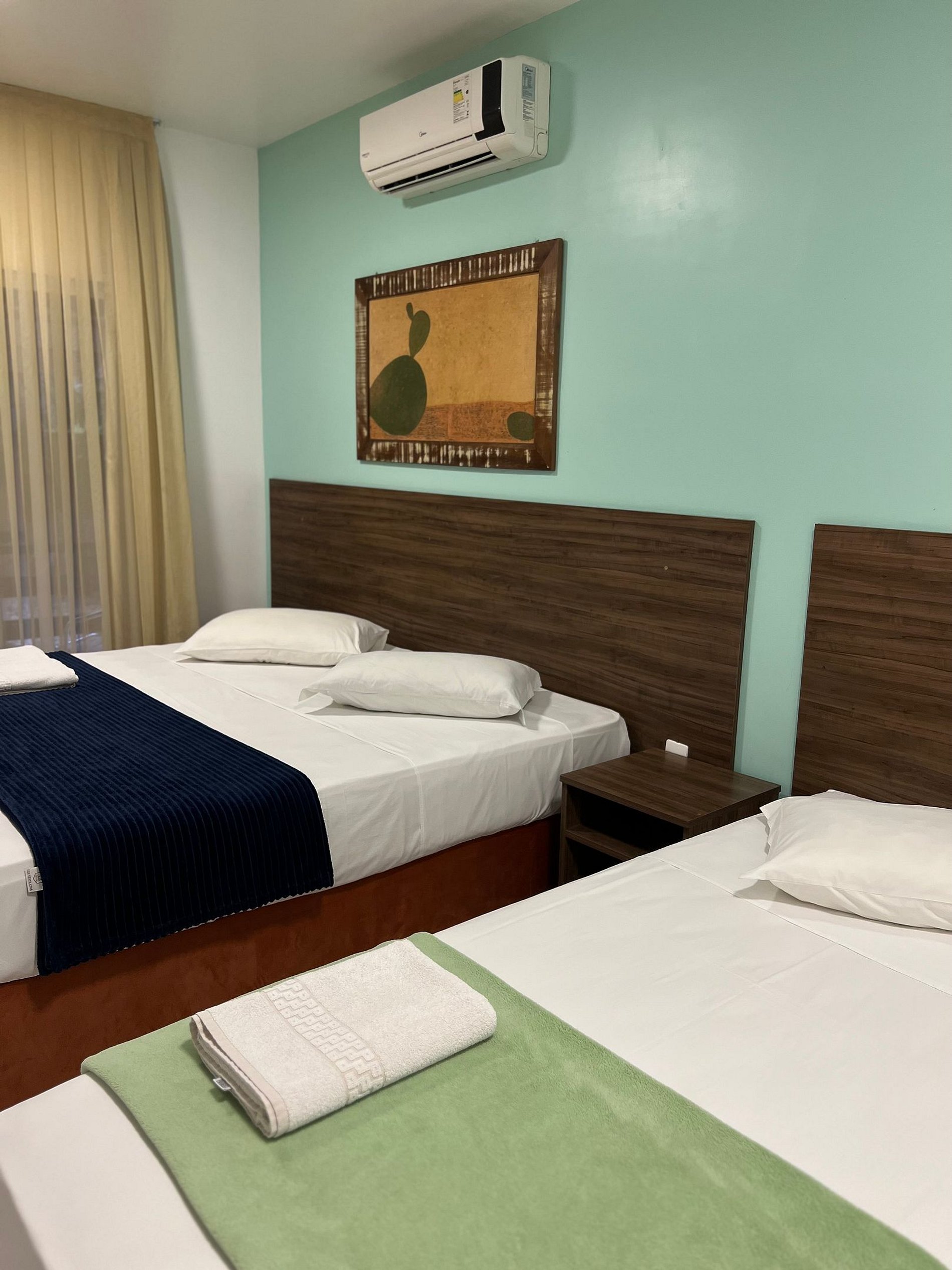 Relaxe em suítes confortáveis com ar-condicionado, TV a cabo e frigobar.