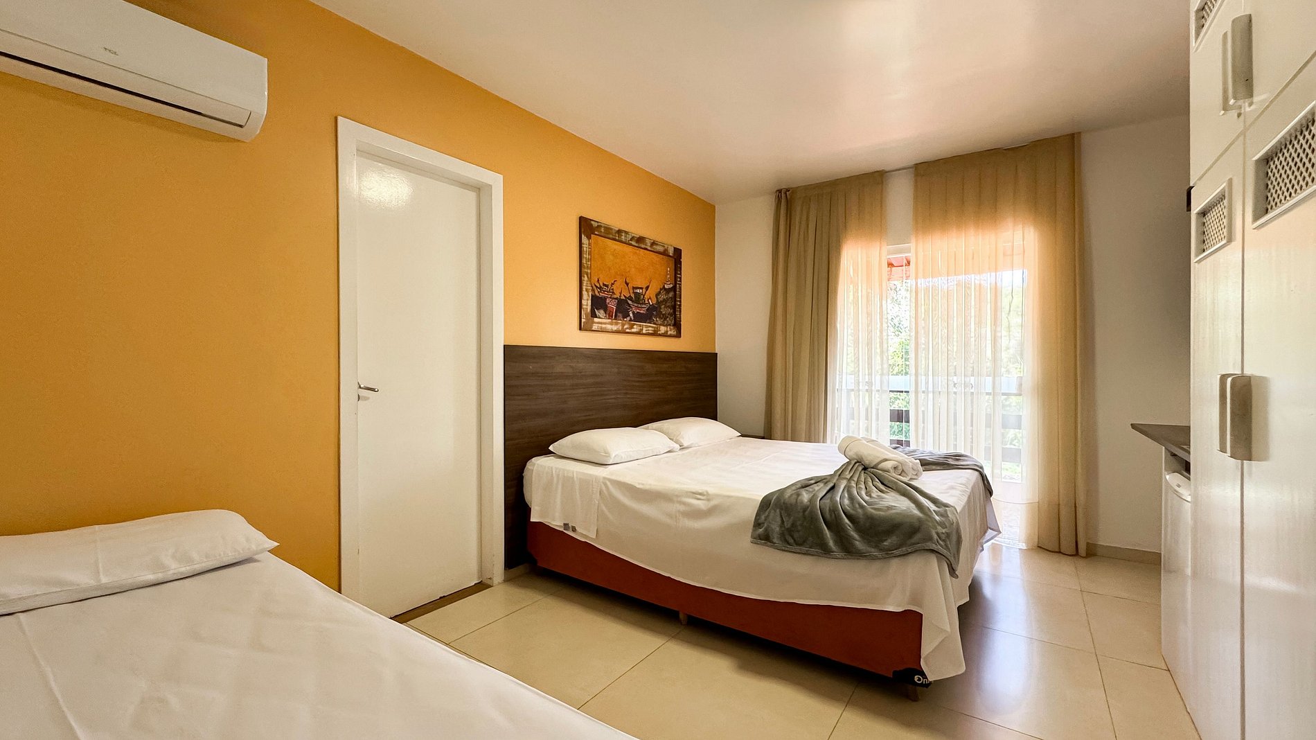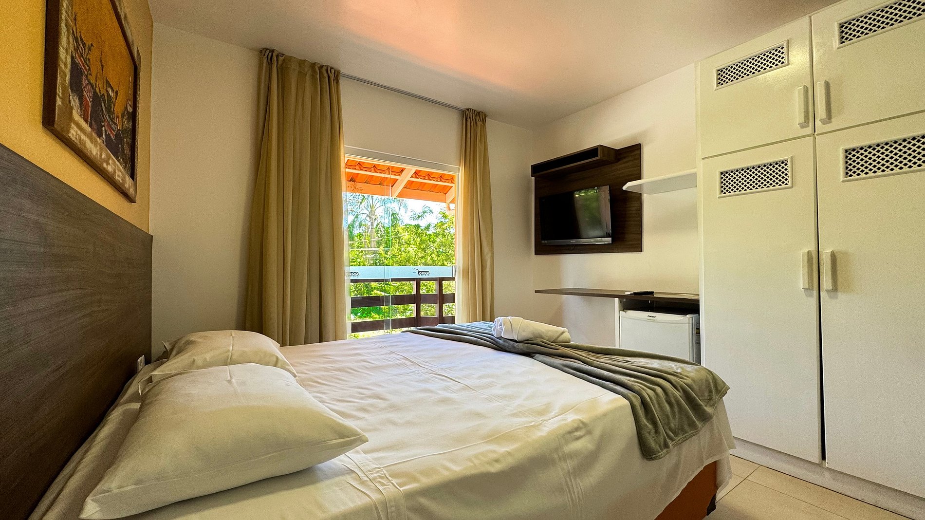 A suíte oferece TV a cabo, frigobar, ar-condicionado, banheiro privativo com chuveiro a gás, e varanda, garantindo uma estadia agradável e relaxante.