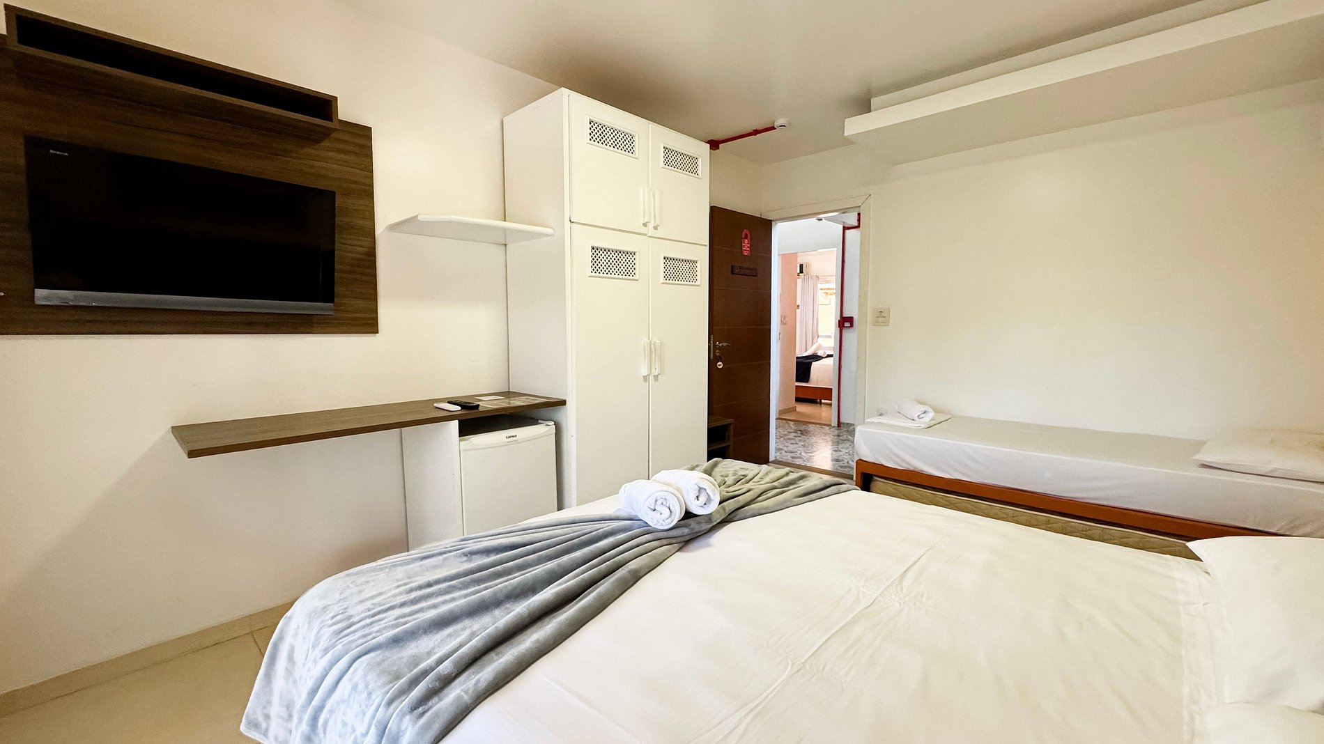 Relaxe em suítes confortáveis com ar-condicionado, TV a cabo e frigobar.