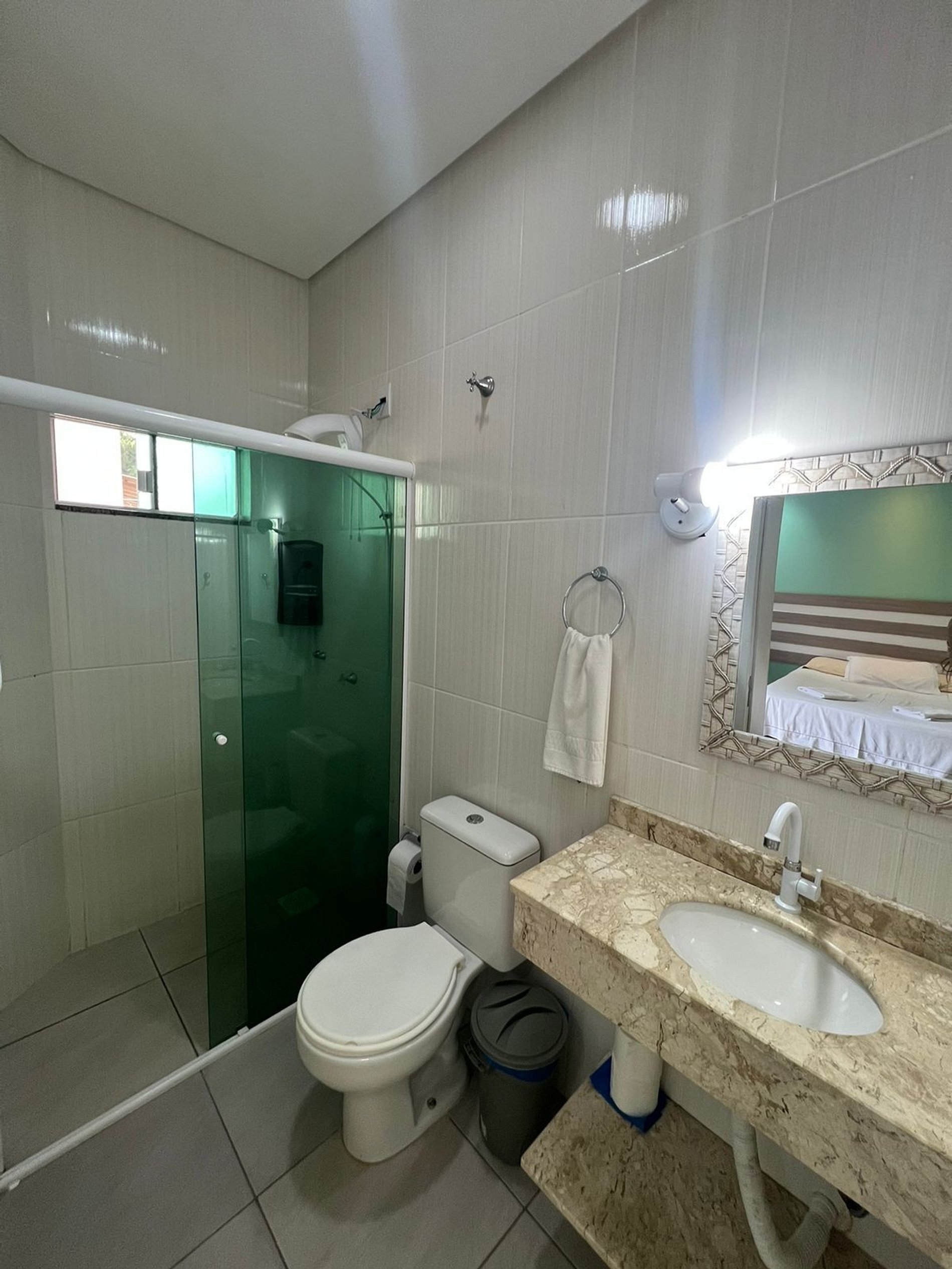 A suíte oferece TV (com canais locais), frigobar, ar-condicionado e banheiro privativo com chuveiro a gás, garantindo uma estadia agradável e relaxante.