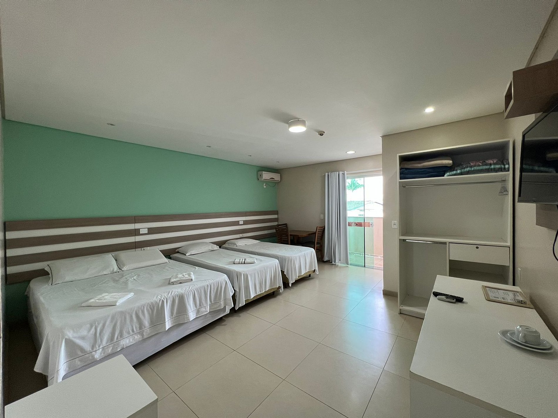 Relaxe em suítes confortáveis com ar-condicionado, TV(com canais locais) e frigobar.