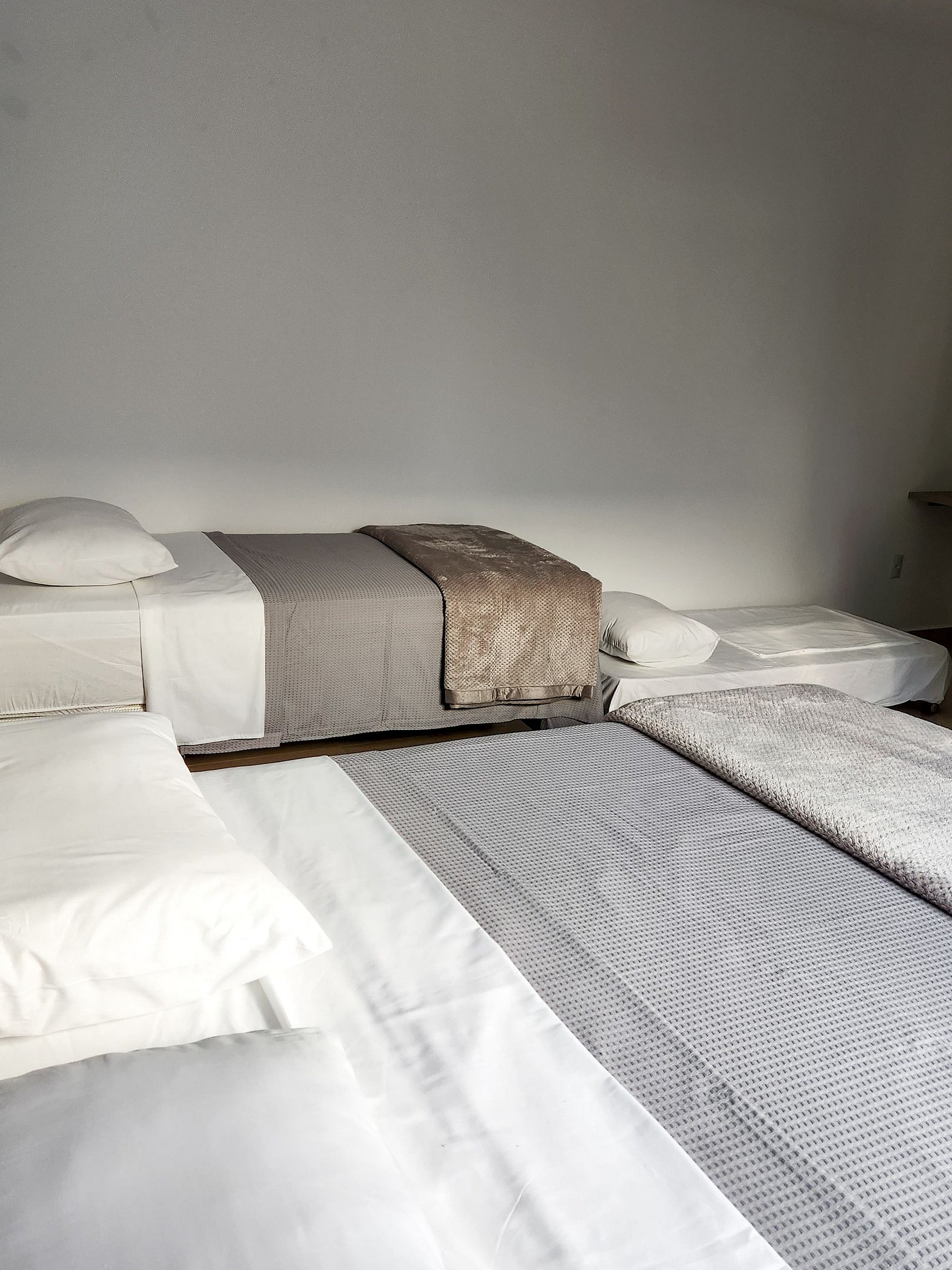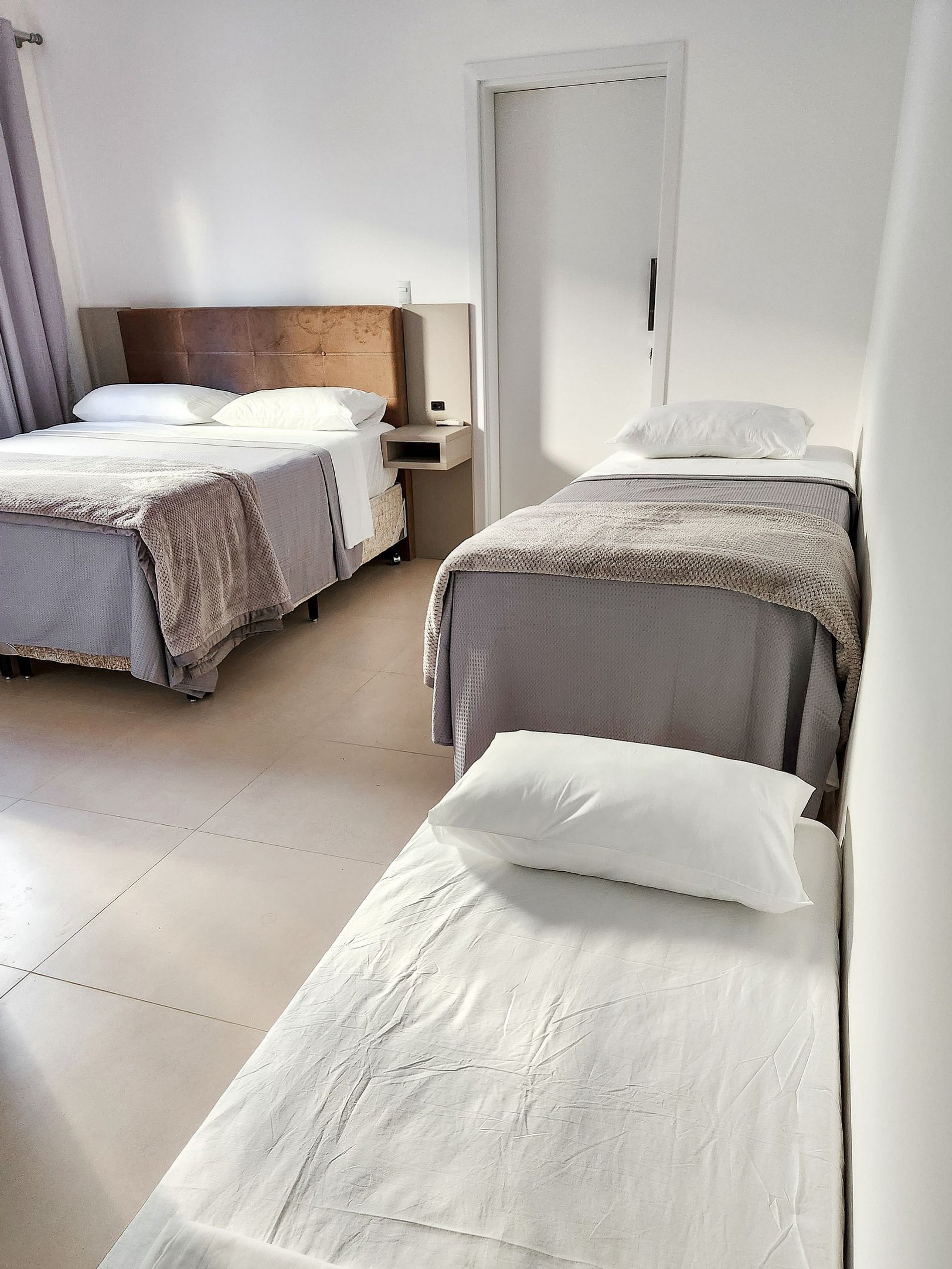 1 quarto com cama de casal Queen, 1 cama de solteiro e 1 cama auxiliar