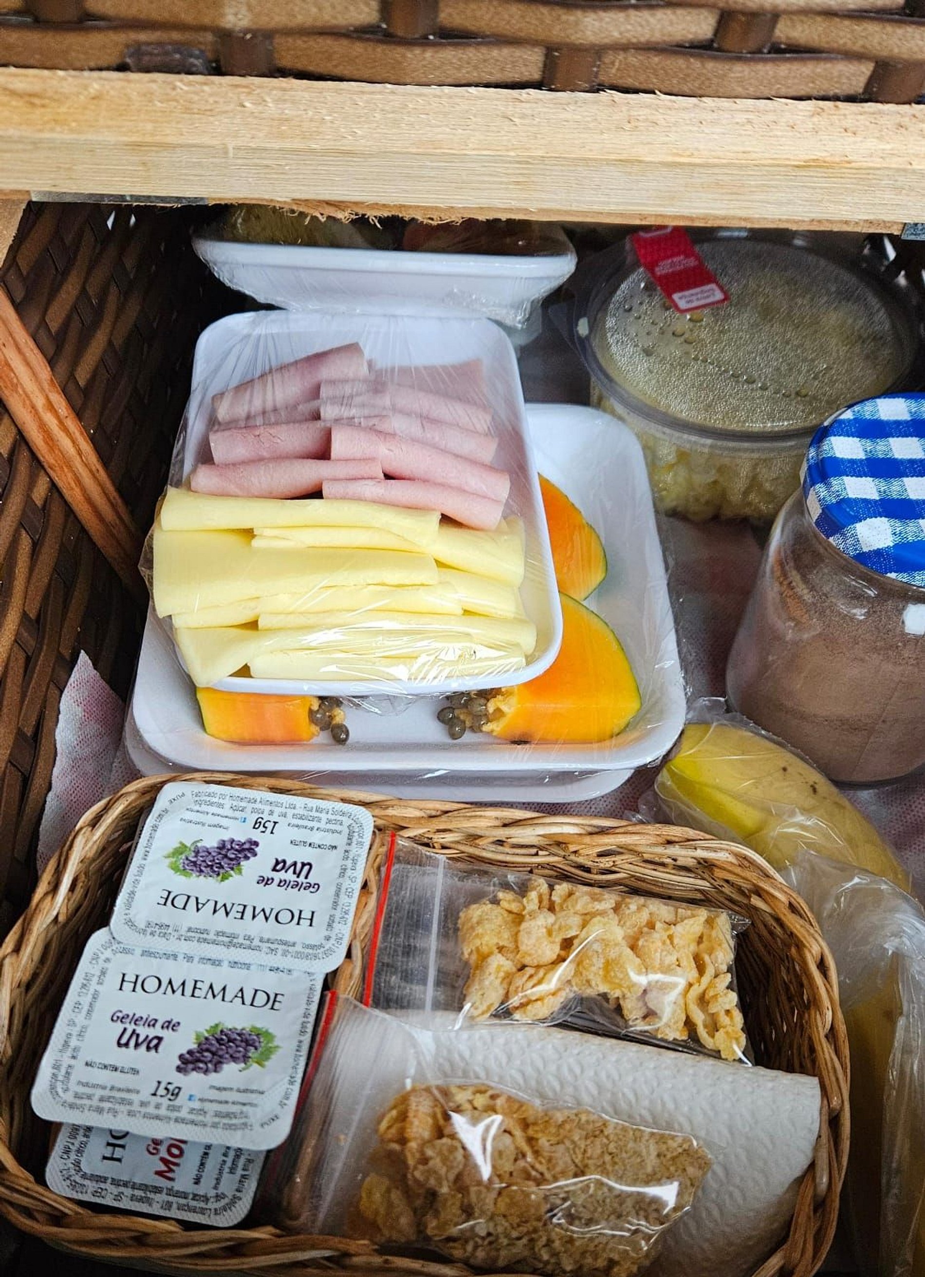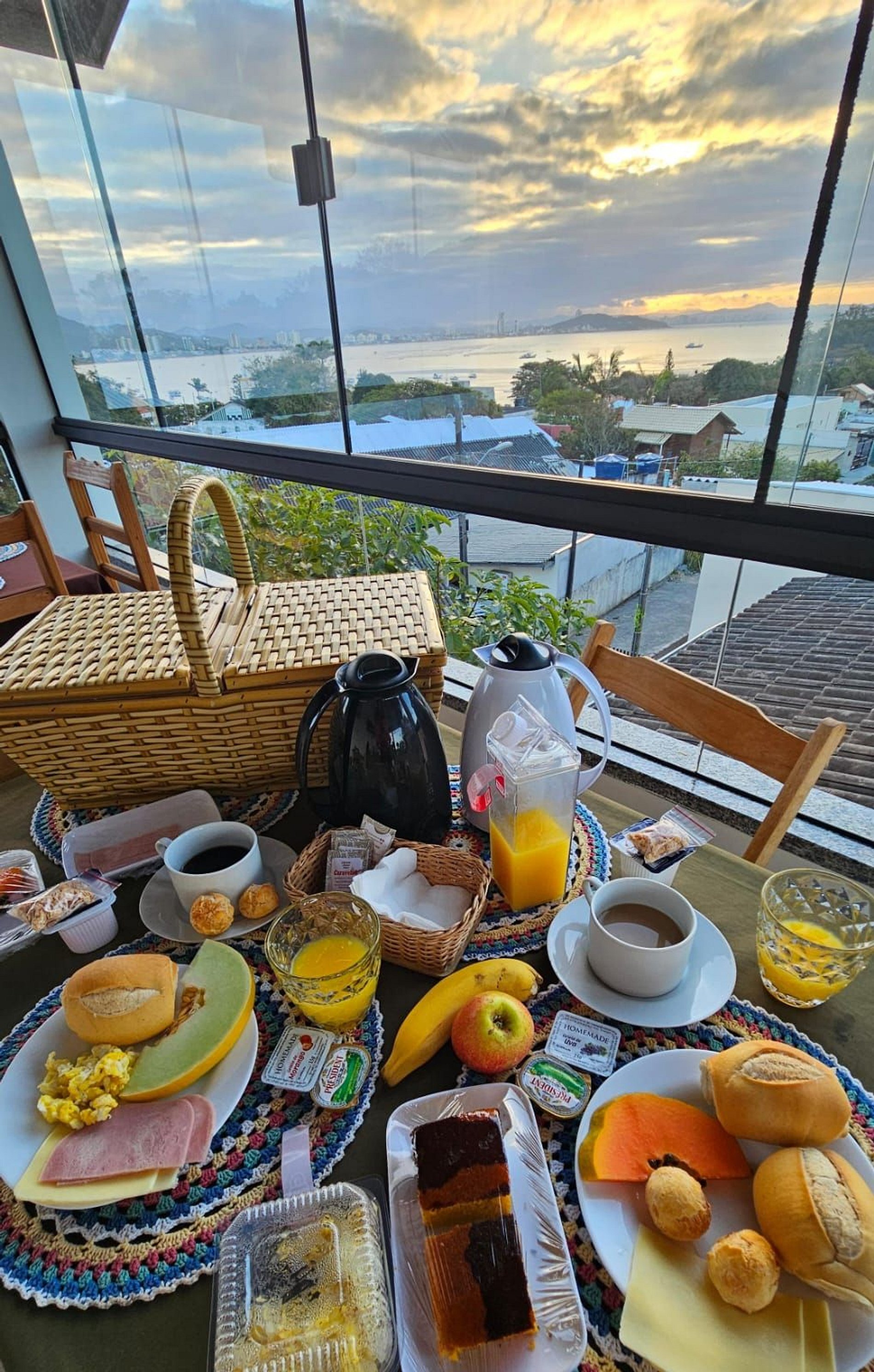 O café da manhã, servido no terraço com uma vista deslumbrante, em cestas de pique nique, é um verdadeiro banquete de sabores caseiros e frescos.
